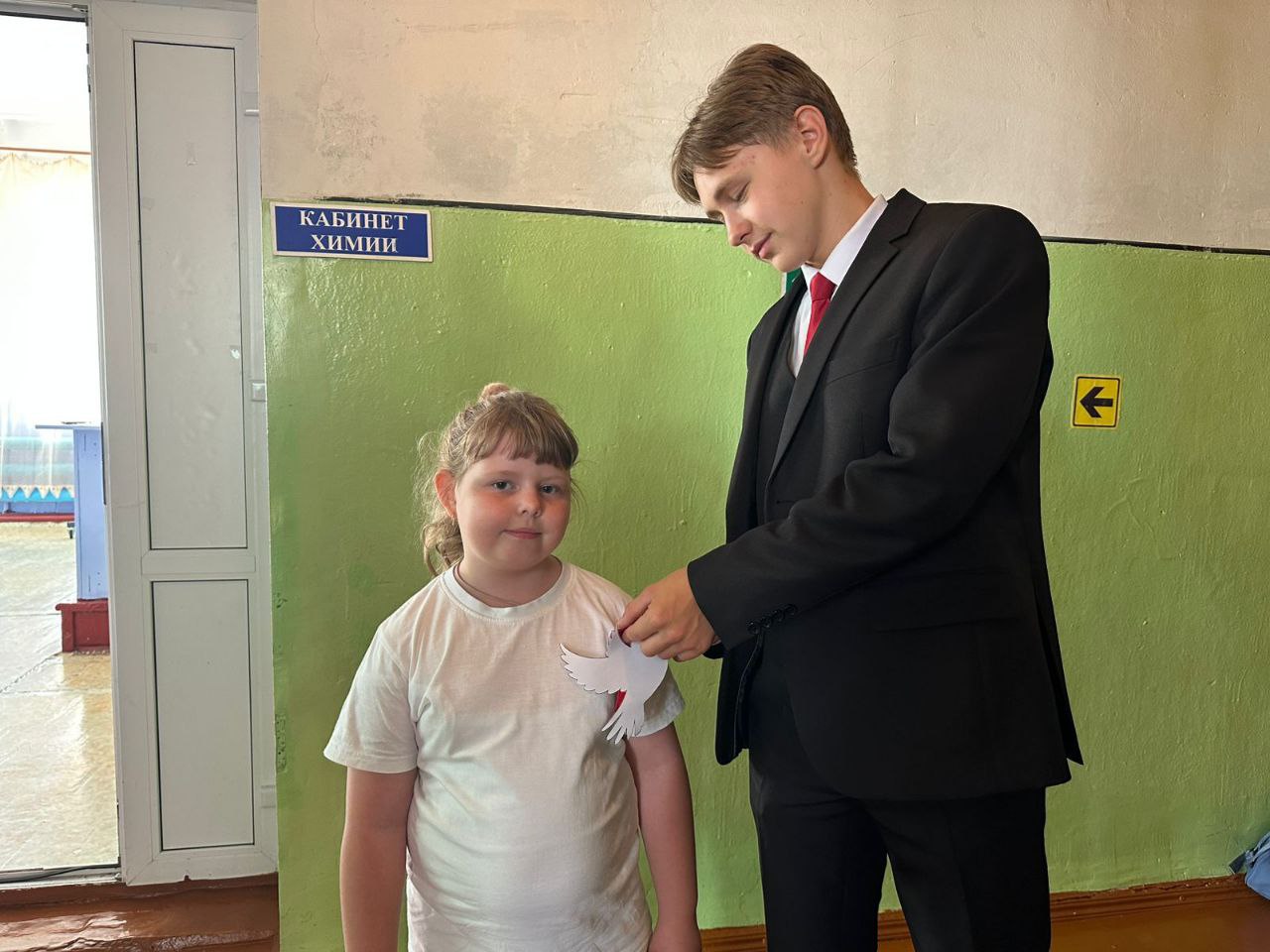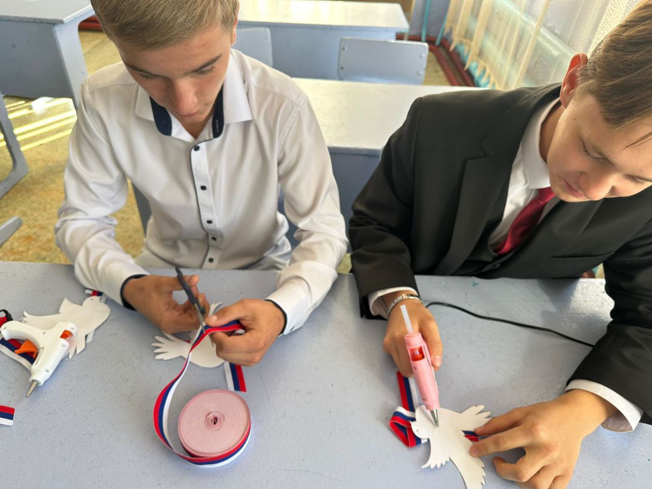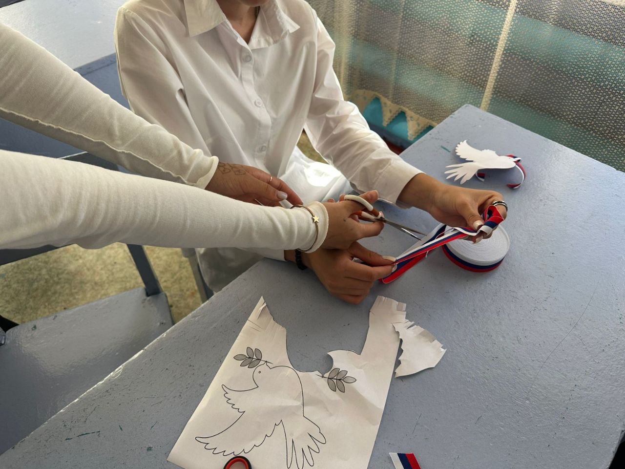 В рамках этого мероприятия ребята мастерили значки из ленты триколор и белых бумажных голубей — символа мира и добрососедства и вручали их людям.